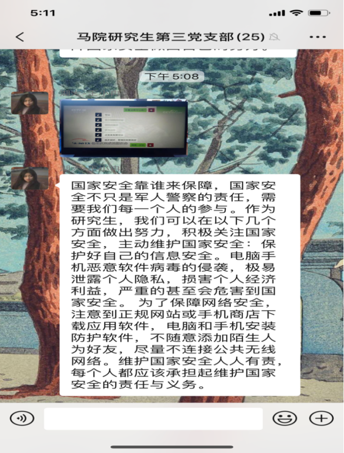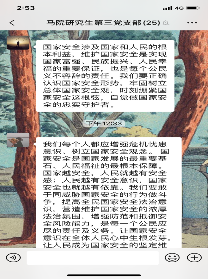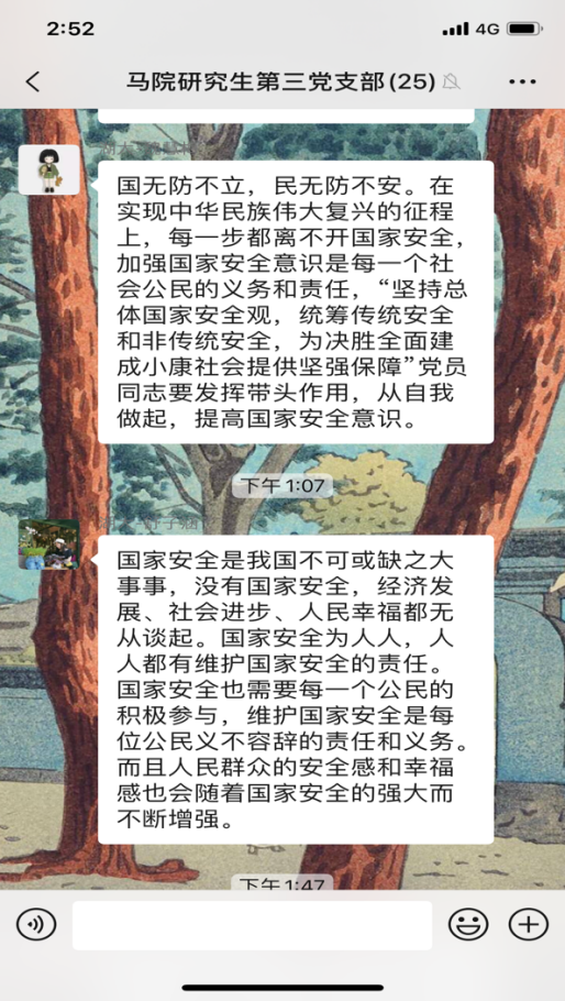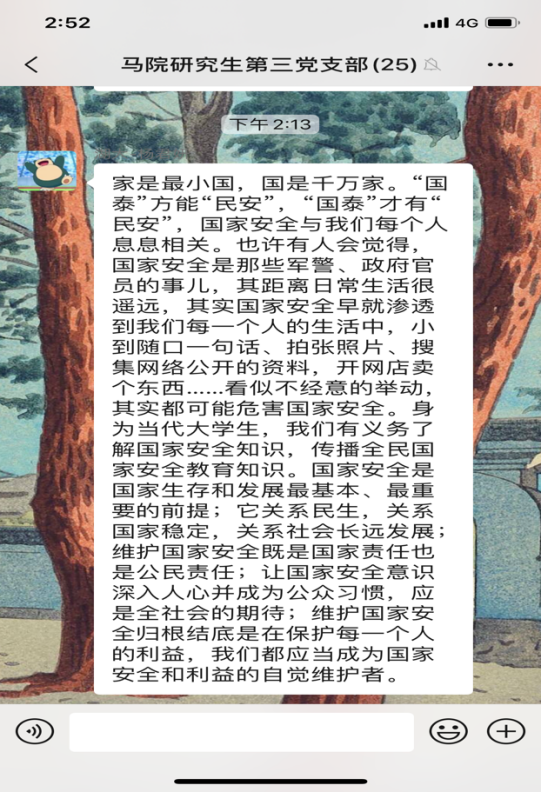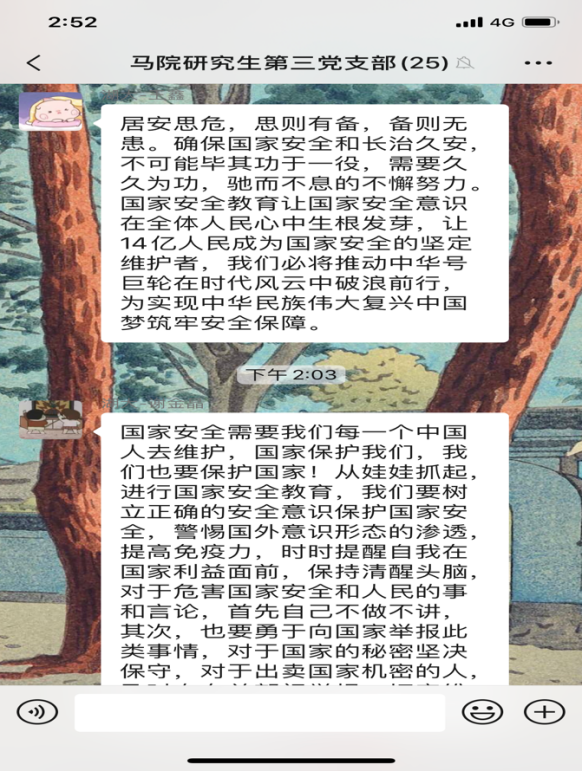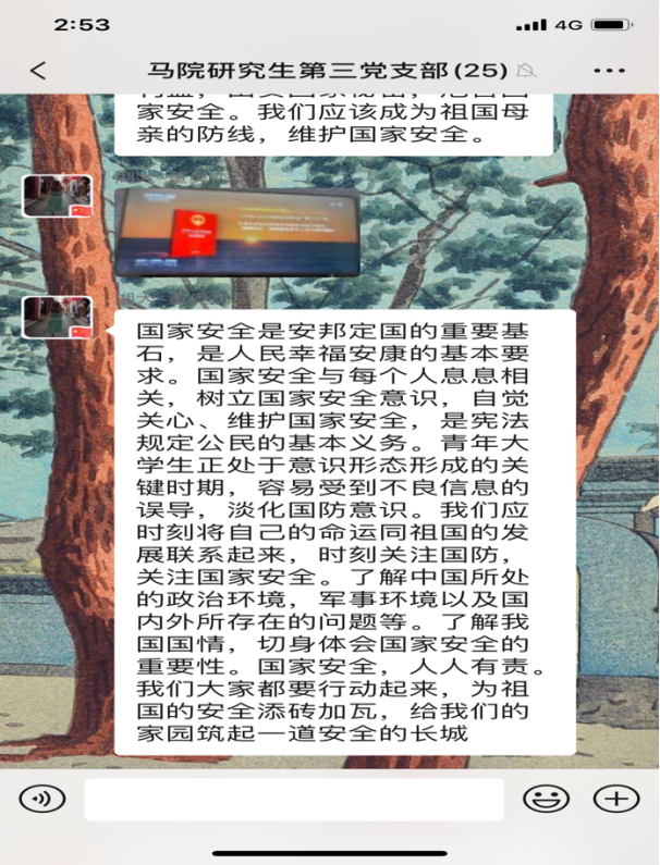 4月15日是第5个全民国家安全教育日,今年的活动主题是“坚持总体国家安全观,统筹传统安全和非传统安全,为决胜全面建成小康社会提供坚强保障”。为更好地开展国家安全教育,4月16日,威廉希尔williamhill研究生第三党支部开展4月份主题党日活动,全体党员同志观看《汇聚人民力量 维护国家安全》专题片。在观看后,同志们感触颇多,纷纷在支部微信群分享观后感。