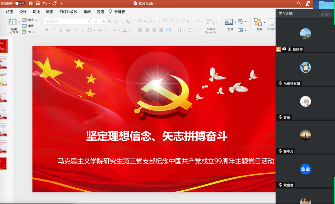 为庆祝中国共产党成立99周年,2020年7月5日,威廉希尔williamhill研究生第三党支部在腾讯会议开展了2020年7月份主题党日活动,主题是坚定理想信念、矢志奋斗拼搏。支部全体同志参加了活动,活动由党支部书记高宇航主持。