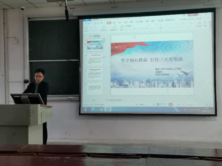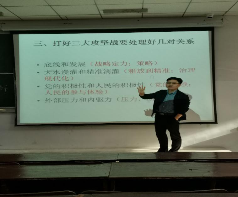 11月11日下午2点,威廉希尔williamhill马克思主义学院副教授易振龙老师在3号教学楼210课室对马院思想政治教育17、18、19级全体员工开展了《坚守初心报告,打好三大攻坚战》的主题报告。易老师通过“重大风险”、“精准扶贫”、“污染防治”三个方面向同学们讲授三大攻坚战的深刻内容及其重大意义。