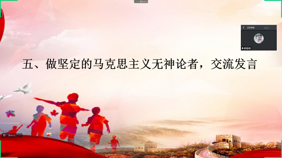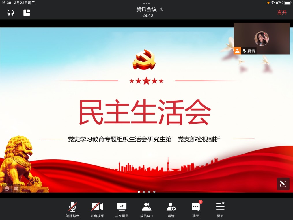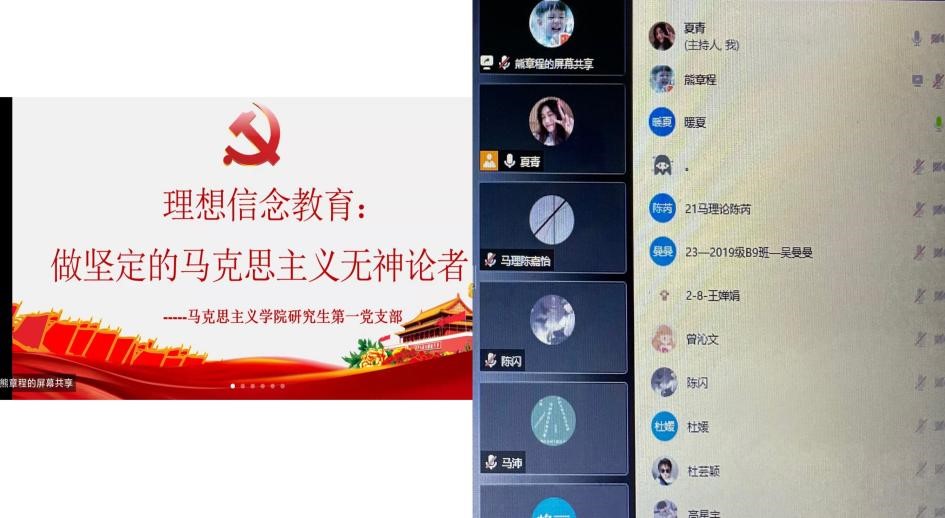 3月23日下午,威廉希尔williamhill研究生第一党支部利用腾讯会议在线上召开以“做坚定的马克思主义无神论者”为主题的三月份主题党日活动暨2021年度组织生活会、民主评议会。支部书记夏青主持会议。