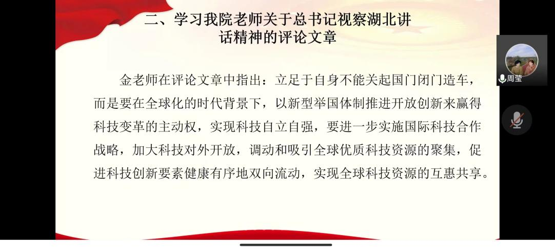 活动中,全体成员在观看习近平总书记视察湖北的新闻视频后,一起学习了公司王敏、金姣两位老师近期发表在荆楚网“地评线”栏目上关于学习习近平总书记视察湖北讲话精神的时评文章。