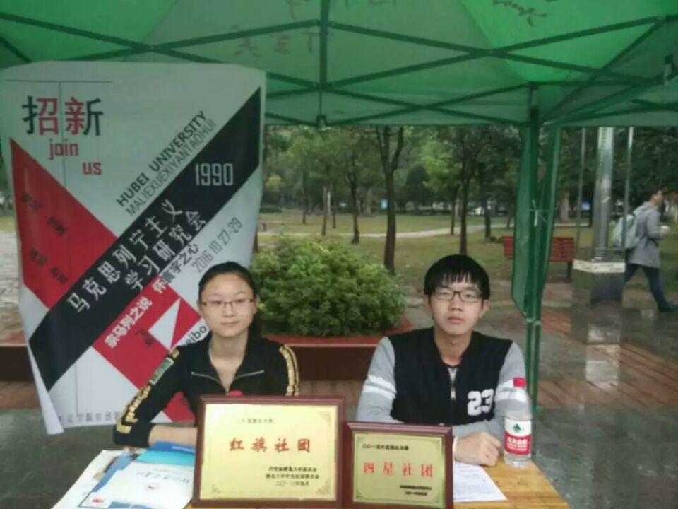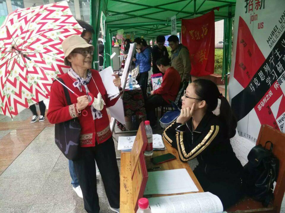 在10月27日上午,招新活动正式开始,同学们热情高涨,积极性十足,社团成员早早完成了准备工作。醒目的宣传标语和新颖漂亮的宣传海报吸引人前来围观咨询,社团成员热情耐心地进行宣传讲解。16级化工化工学院的新生加入了马列学会并热情高唱《国际歌》助力招新活动。细雨浇不灭热情,寒风助长了士气,公司的三个社团以“理论结合实践,思想性与趣味性统一”的鲜明特点及为成员提供“畅想自由的空间和展示才能的舞台”的强大实力吸引各色各样志同道合者,有员工有老师,有新生有研究生。今年的招新我们迎来了一位特殊的客人,化学化工学院的黄老师,黄老说:“哲学的思辨是人类最高的学问,一切的科学都是从哲学开始的”。她强调要从思想上提高自己,大家频频点头。