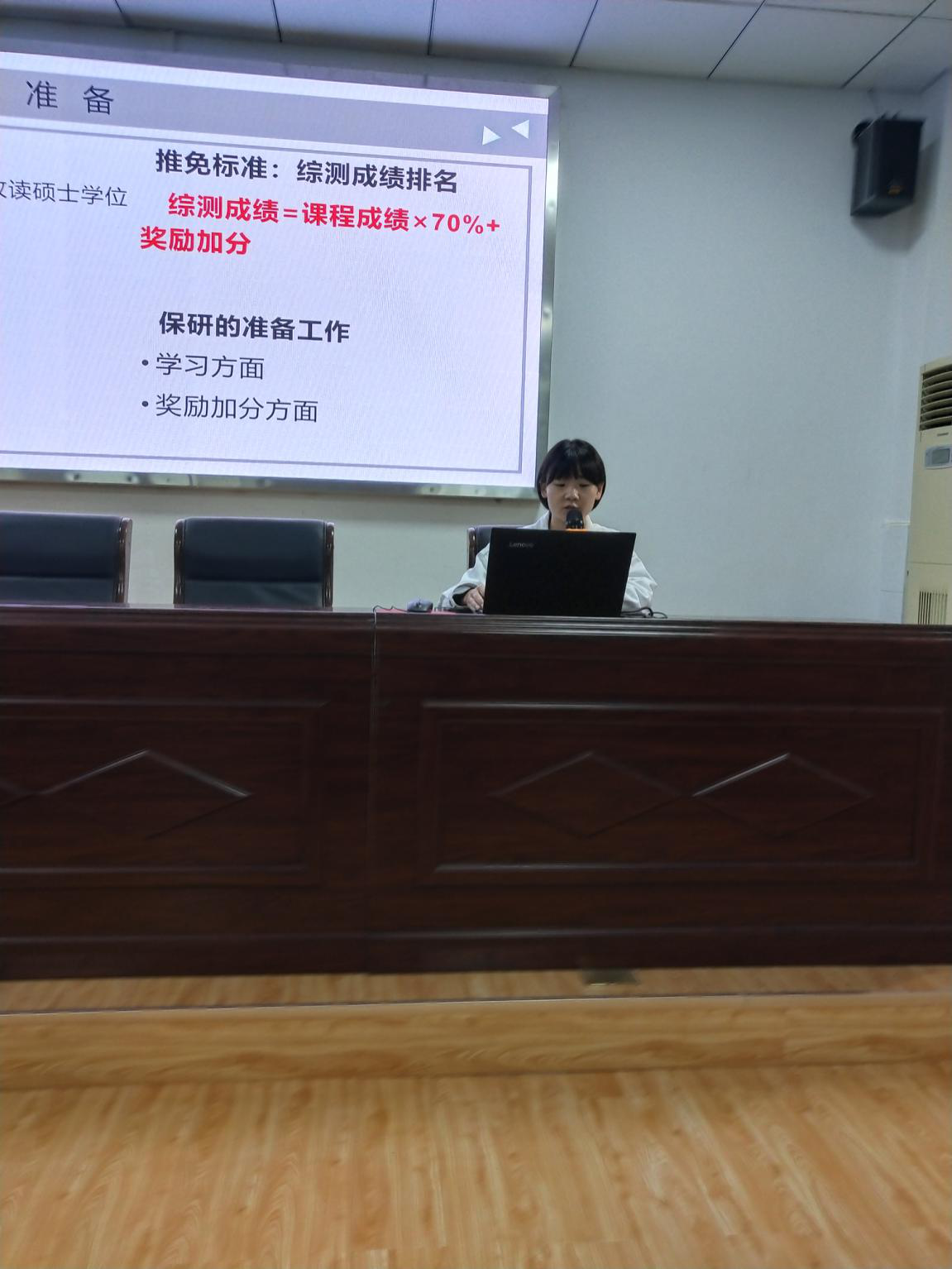 首先进行发言的是推免进入华中师范大学的肖杏。她重点为我们介绍了保研的前期准备与保研程序时应该注意的事。她尤其强调了学习方面需要达到的目标,比如英语、专业课的成绩硬性指标。此外还介绍了获取奖励加分的具体措施等。在介绍保研的面试时,学姐强调了面试应该举止大方、实事求是,发挥自己的正常水平。