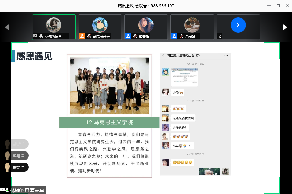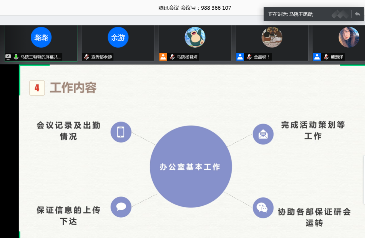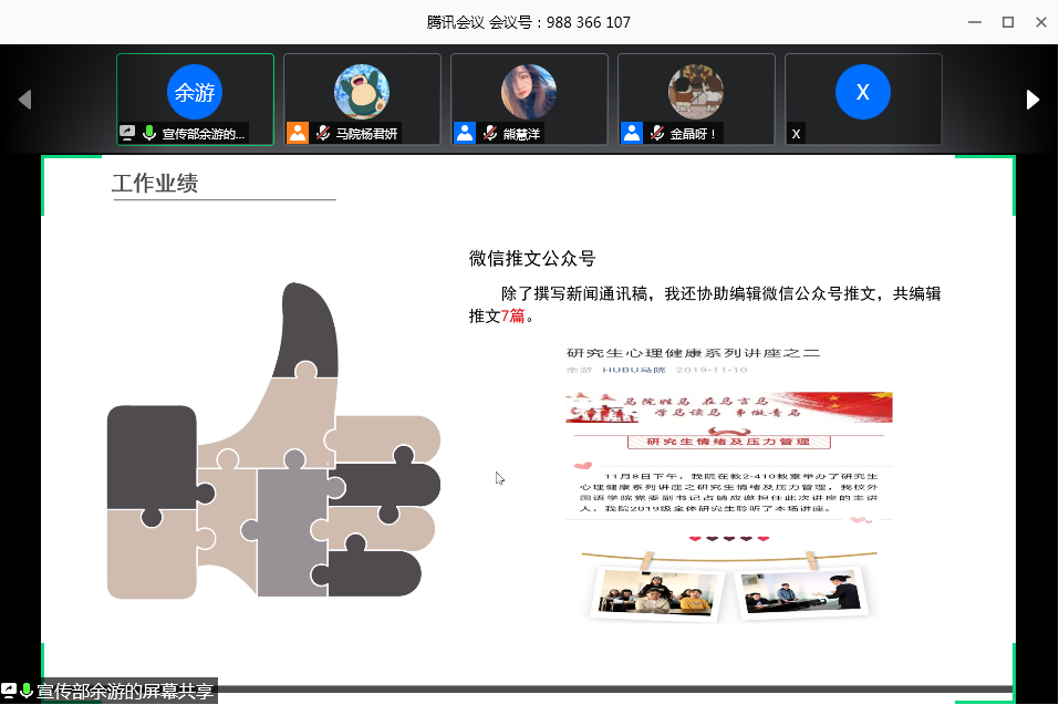 会议第二项议程,由王璐璐、史健桥、李菀、熊罗美婧、李睿、余游、杨瑶和林婉8名同学依次进行个人工作汇报。各汇报人分别从工作态度、工作能力、工作内容和工作业绩四个方面总结自己2019年度研究生会的工作情况。其中,办公室主任王璐璐展示了研会百度云盘文件收录情况、活动及会议考勤记录情况,做好研会工作的痕迹管理;宣传部部长余游围绕多媒体工作开展情况,讲述自己的工作心得,努力打造研会对外的窗口;文体部部员李菀、李睿在汇报中说,从参与研会工作中得到成长,感受到马院一家亲的温暖;学术部部长史健桥致力于策划学术型活动,活跃学院学术氛围,在“学术科技节”中表现突出;权益部部员杨瑶秉持着细致认真、严谨周到的工作态度,负责研究生心理健康服务、研会资金流转。八位汇报人的讲述,回顾了过去一年研会工作的点点滴滴,展现出公司研会的责任与担当。