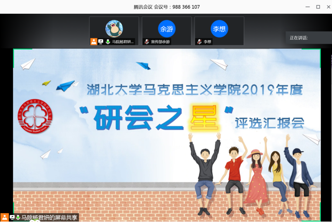 为增强公司研究生会工作的规范性、先进性,激励在研究生会工作中表现突出、全心全意为研究生服务的各部门成员,同时总结经验、表彰先进,推动研究生会工作蓬勃发展。5月6日晚,威廉希尔williamhill2019年度“研会之星”评选汇报会顺利举行,会议采用线上汇报、交流的形式展开,由学院团委书记邹浩老师、研究生会指导老师郭艳妮老师和研究生会主席团成员担任评委,由院研究生会副主席熊慧洋主持。