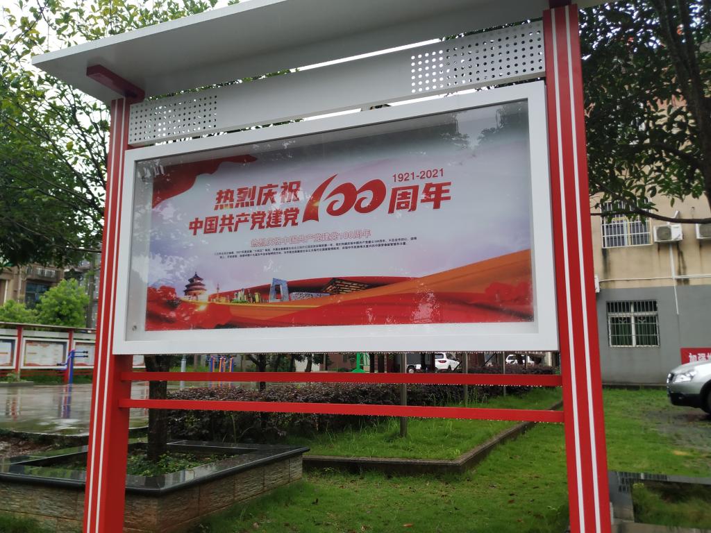 (图为宝塔村村委会门前“庆祝建党100周年”的展板)