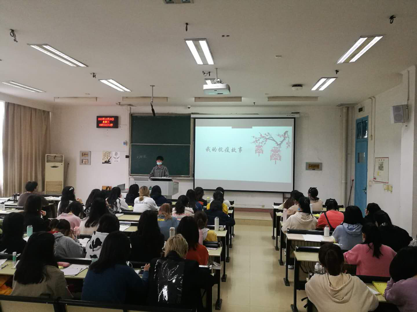 刘欣悦、刘兆雯等五位同学主动上台,面向全班同学,或讲述自己亲身经历、耳濡目染的抗疫故事,或上升至理论高度,谈起自己对国家政策和党的领导的深刻感悟。分享展示内容丰富、角度多样,对自己、对同学都是一场无形的抗疫精神教育、思想政治教育。
