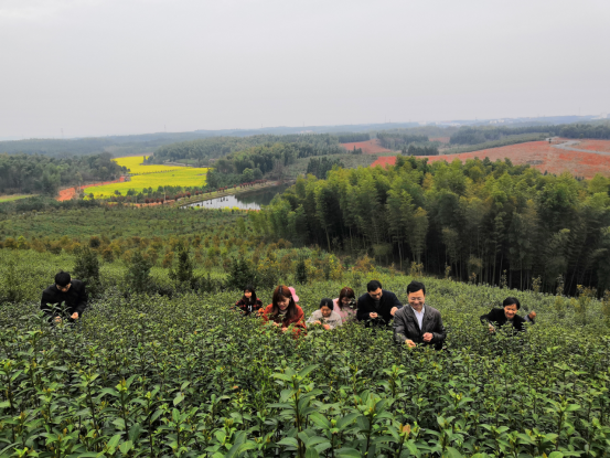 入户访谈结束后,为让研究生能够深入了解农村生产建设实际,公司师生在汀泗桥镇副镇长张月的陪同下走进万亩茶园,帮助茶农采茶。在摘茶的实践中,师生体会到了丰收的喜悦,同时也感知农村生活不易。此次调研恰逢当地正在举办千亩油菜花节,师生在走访调查中深有感触,纷纷表示在国家大力推进乡村振兴战略背景下,农村的发展势头值得欣喜。以熊家湾为例,师生通过走访观察,发现目前的新农村建设让很多村民过上了让城里人艳羡的生活。