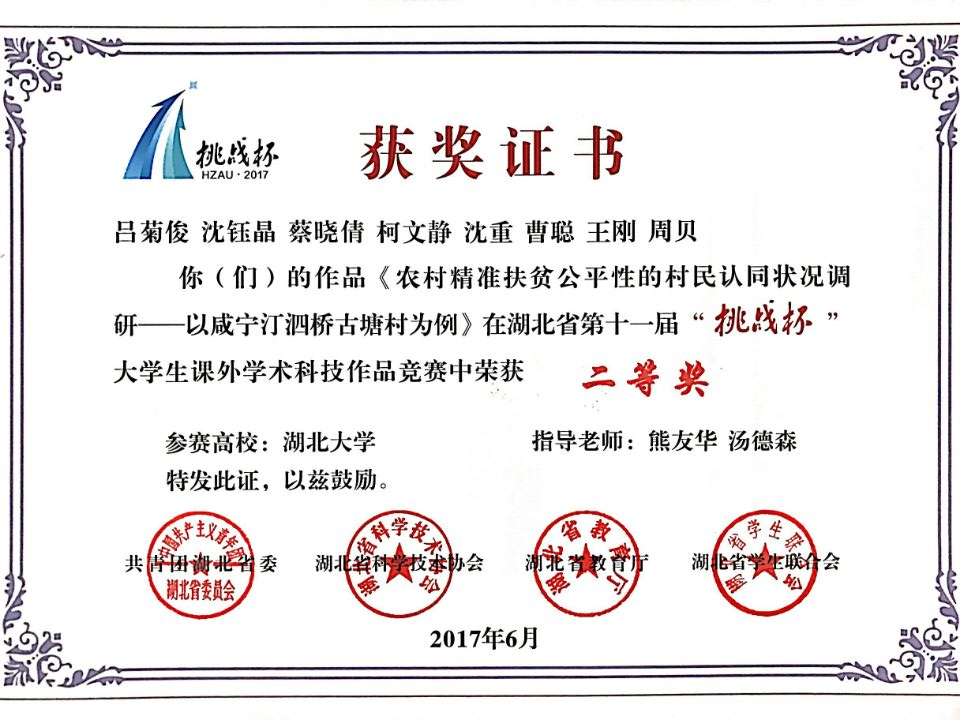 自2016年6月学校启动校内赛筹备工作,公司依托2016年暑期社会调研成果,精心组织、广泛动员,员工积极参与、认真备战,共有3个作品经学院初选推荐进入学校初赛。经校复赛、决赛的层层选拔,并聘请校内外专家参与评审、模拟问辩等程序,公司《农村精准扶贫公平性的村民认同状况调研——以湖北省咸宁汀泗桥古塘村为例》作品(指导老师:熊友华、汤德森)最终在全校82件作品中脱颖而出,成为晋级省“挑战杯”竞赛的12个作品之一。