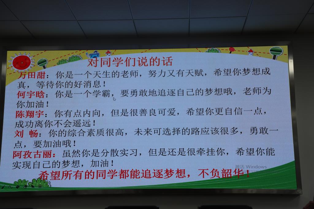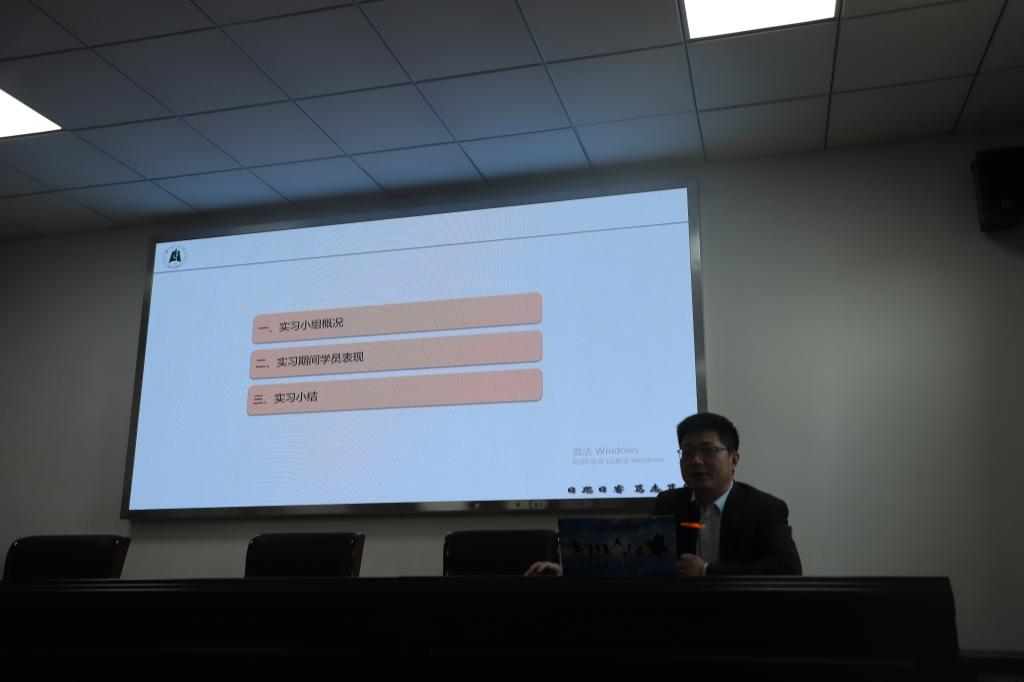 第一位上台的是翟艳芳老师。翟老师首先总结了小组成员及其实习概况。随后,翟老师介绍了本组同学们的实习经历,包括有的同学同时教授两个年级的课程,在巨大的压力中迅速成长;有的同学以一名正式教师的标准要求自己,记住了班内每位同学的名字,此乃教师的基本功;有的同学治住了班内挑皮捣蛋的员工,让学校教师大感惊讶等等。