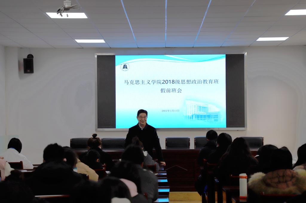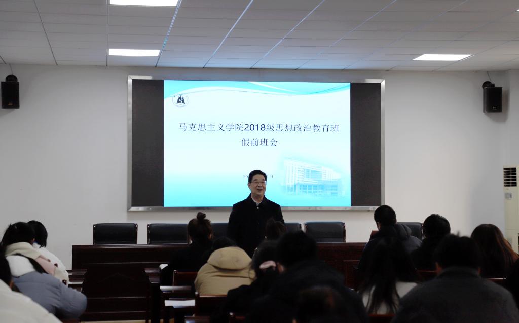 1月11日下午,威廉希尔williamhill2018级思想政治教育班举行主题班会,威廉希尔williamhill副董事长钱建国作为副班主任出席本次班会,2018级思政专业全体同学参加,班主任邹浩老师主持会议。