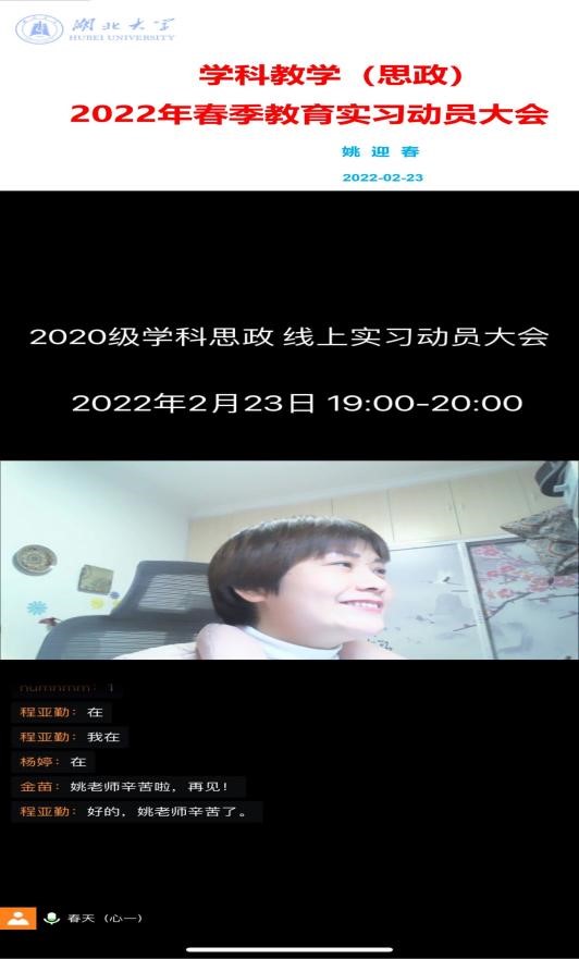 为确保疫情期间公司教育硕士2022年春季学期的实习工作顺利推进,2022年2月23日晚上7点,公司召开了2020级学科教学(思政)专业线上实习动员大会。会议由学科负责人姚迎春主持,校内指导老师杨婷、程亚勤以及2020级学科(思政)专业全体同学参加。