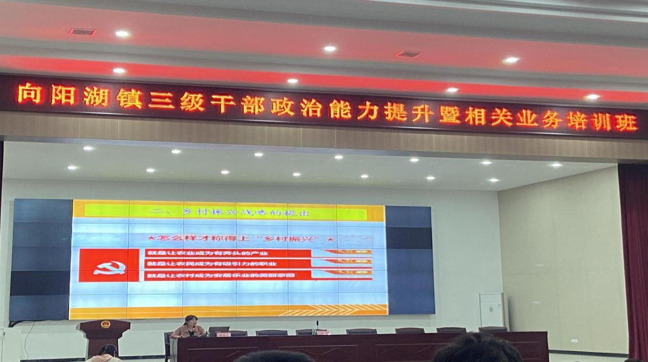 2022年4月29日,公司“理论热点面对面示范点”咸宁市咸安区向阳湖镇为提升干部政策水平、业务素质和工作能力,举办了“镇、村、组三级干部政治提升暨相关业务培训班”,学院龚梦副教授为向阳湖镇村党员干部集中宣讲乡村振兴战略。咸安区向阳湖镇党委书记陈伟、咸安区向阳湖镇各村(社区)“两委”、组长及镇直部门负责人共262人参加了此次培训会。