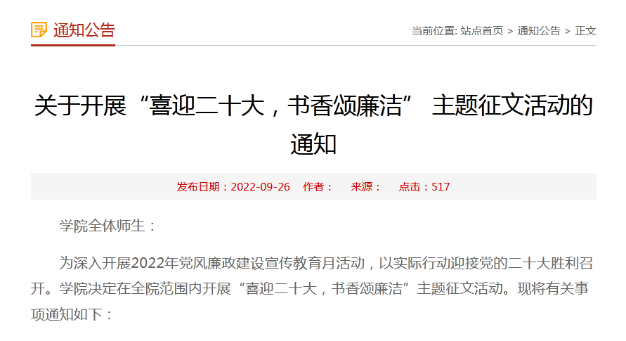 近日,为深入开展2022年党风廉政建设宣传教育月活动,以实际行动迎接党的二十大胜利召开,学院组织开展了“喜迎二十大,书香颂廉洁”主题征文活动。征文活动面向学院全体师生,设一等奖2名,二等奖3名,三等奖5名,优秀奖若干,着力推出一批有特色、有分量、有影响的廉洁文化成果。