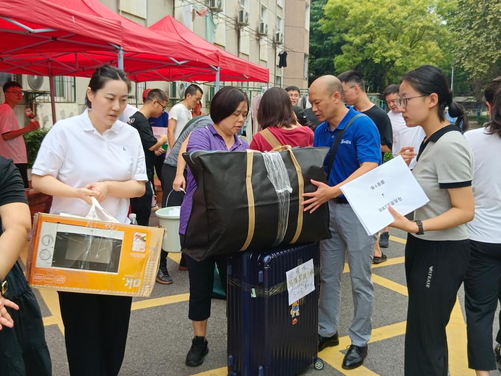 回迁工作小组按照事先计划进行现场引导与协调,并为回迁员工进行楼层方向的引导并帮助搬运行李至寝室。为了避免行李遗失,学院安排了志愿者看守现场行李,整个搬运过程分工明确、井井有条,十分有序。空气湿热,气温超过三十多度,参加搬迁工作的每一个人的衣服被汗水浸湿,但脚步从未停歇。从车上搬下行李、一层层爬楼搬运行李、快速跑下楼搬下一趟行李……大家都认真负责地将自己的任务落实到位,毫无怨言。