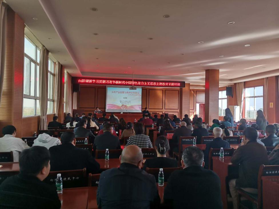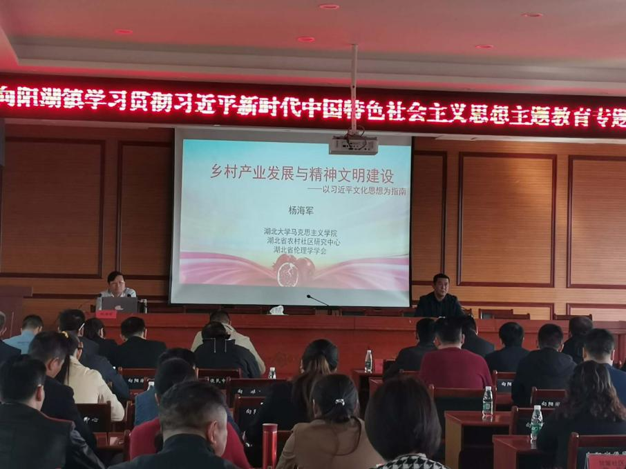 (通讯员 邢肖依)2023年11月6日,向阳湖镇举办“学习贯彻习近平新时代中国特色社会主义思想主题教育专题培训”,学院杨海军老师受邀做了“乡村产业发展与精神文明建设”主题宣讲。会议主会场设在向阳湖镇便民服务大厅四楼会议室,各村会议室、宝塔社区会议室设分会场,全体镇干部、村(社区)两委干部、国土所、林业站负责人、各村(社区)党员参加了宣讲报告会。报告会由向阳湖镇党委书记陈伟同志主持。