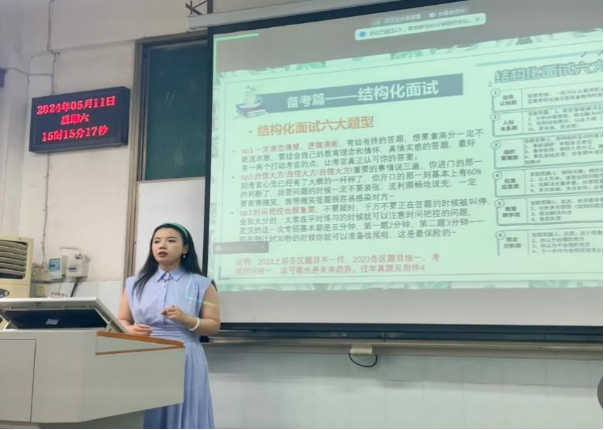 5月17日下午,冯秋月同学就教学竞赛上岸经验、自身求职经历,从面试穿着、教姿教态、教学内容选择、教学活动设计等多方面,为同学们进行系统的讲解。