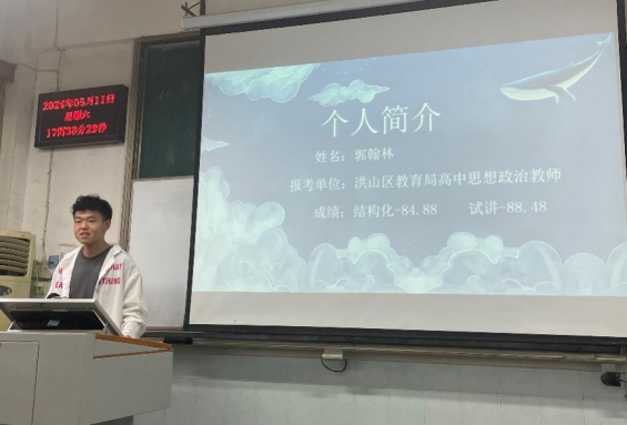 5月11日下午,郭翰林同学为同学们讲述了自己上岸洪山区教育局高中思想政治教师的故事,从备考准备、考试流程、当前工作心得几方面,鼓励同学们要树立信心,深耕专业知识。同时要善于反思,善用巧思,“讲好、讲活、讲深”高中思政课。